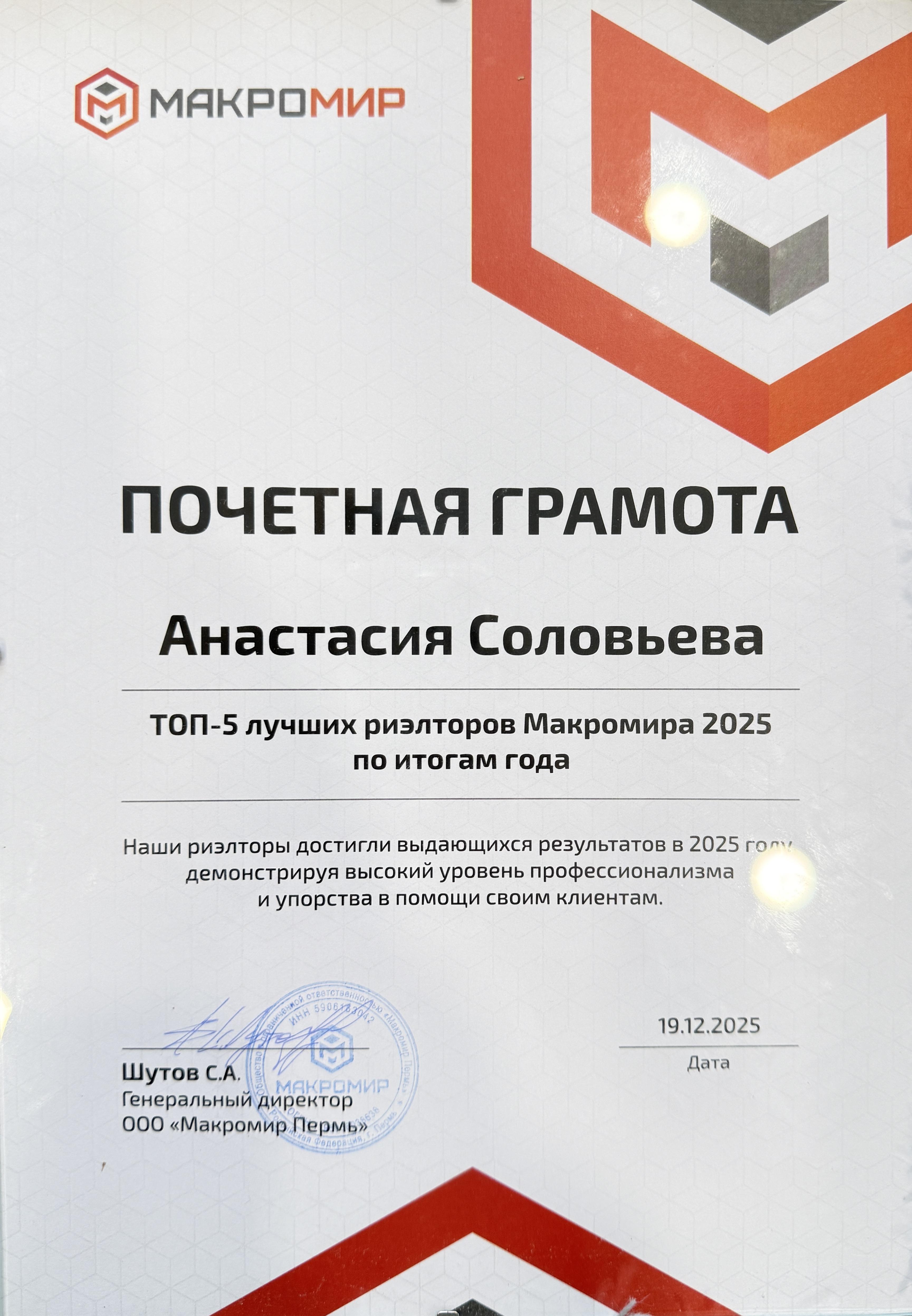 Благодарим Соловьеву Анастасию за помощь в продаже квартиры. Все быстро, профессионально и грамотно. Мы довольны результатом, советуем агенство "Макромир" и конкретно Анастасию Соловьеву.
