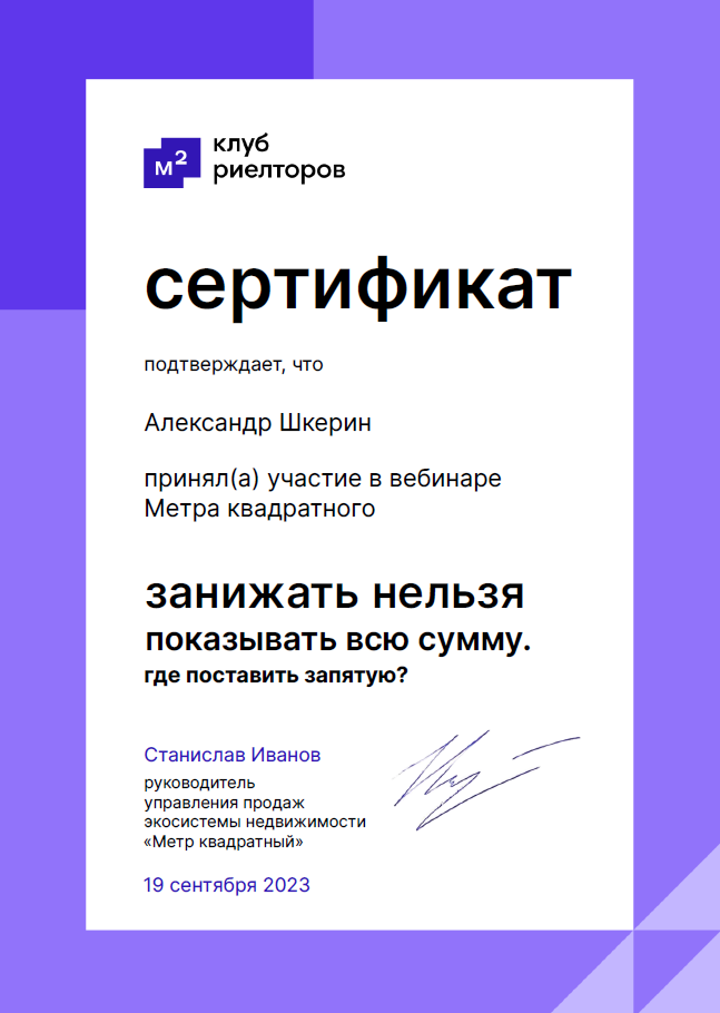 Выражаю благодарность Александру за профессионализм и юридическую грамотность в ходе сопровождения сделки по продаже и покупке моей недвижимости. Это добросовестный, порядочный и честный человек, знающий свое дело. Всегда рекомендую его своим знакомым, как высокопрофессионального риэлтора.