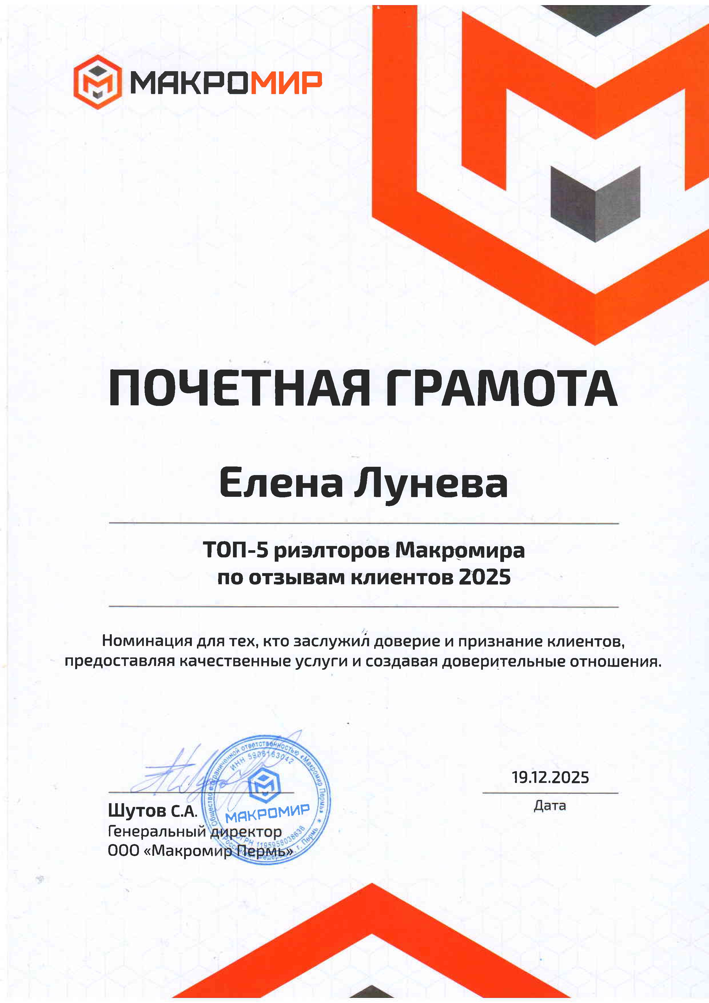 Хочу поблагодарить агентство "Макромир", а именно эксперта по недвижимости Лунёву Елену. К Елене обращаемся уже не первый раз. Можно считать уже как семейный риэлтор.