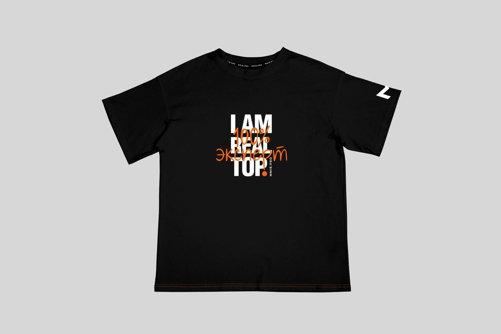 Для тех, кто хулиган в душе. Плотная чёрная ОВЕРСАЙЗ футболка с надписью "I AM REAL TOP." и "100% эксперт" на груди. Надписи на груди и логотип на рукаве выполнены методом машинной вышивки.
